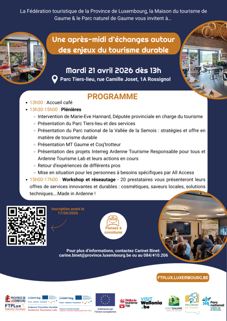 Programme complet : https://parc-naturel-gaume.be/apres-midi-dechanges-autour-des-enjeux-du-tourisme-durable-21-avril-2026-a-rossignol/